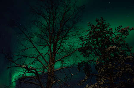 solar flare creates strong vibrant aurora borealis on the winter night sky over forest and trees
