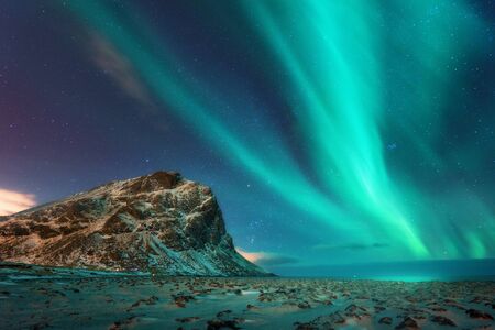 Aurora borealis above the snowy mountain and sandy beach in winter at night. Northern lights in Lofoten islands, Norway. Blue starry sky with polar lights. Landscape with aurora, frozen sea coast