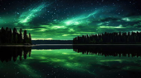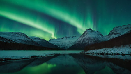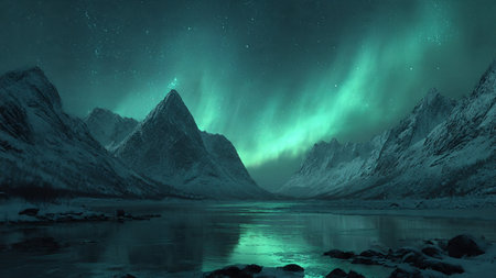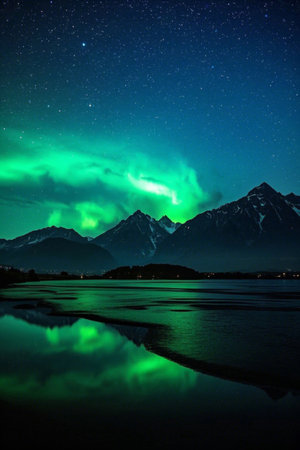 An illustration captures the aurora borealis illuminating the night sky with vibrant green colors. The image features a mountainous backdrop with the glow reflected on a body of water. This captivating scene could be used for various projects, including editorial features or commercial designs, evoking wonder and natural beauty.