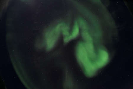 Green glow of aurora borealis in the night sky.