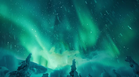Swirling aurora borealis above frosty mountain peaks creates a breathtaking nocturnal landscape in the polar region