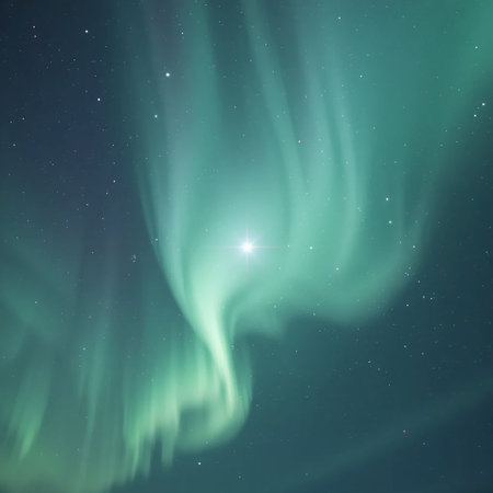 A bright star shines within a swirling vortex of vibrant green aurora borealis against a dark, star-filled night sky.