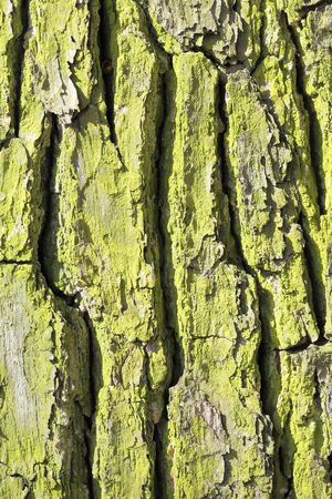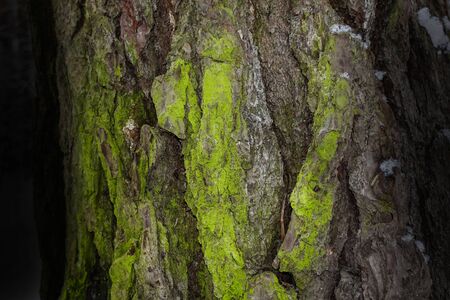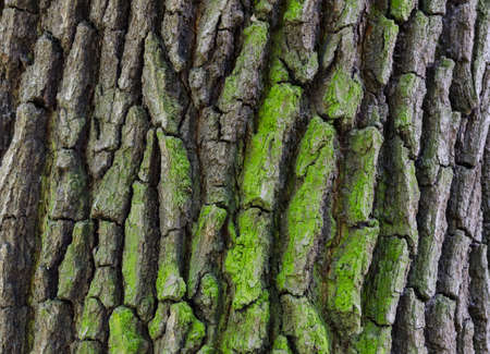 Oak bark covered with green lichen. Natural backgrounds and textures