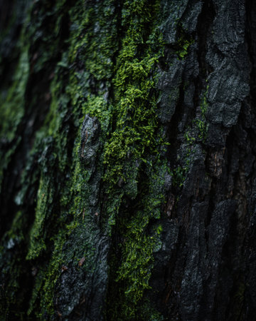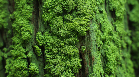 Soft green moss blankets rough tree bark creating a vibrant and tranquil atmosphere in nature.