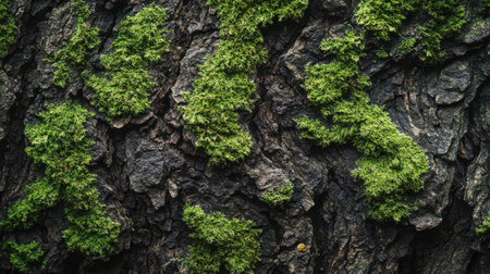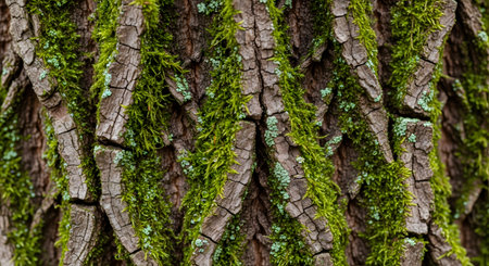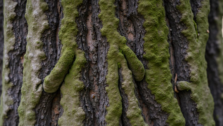 Close-up view of textured tree bark covered with green moss, showcasing intricate patterns and natural beauty. Perfect representation of nature's elements.