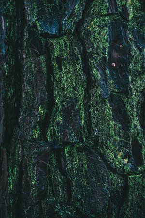 The bark of an old green tree in a dark forest, mysterious, beautiful, amazing nature