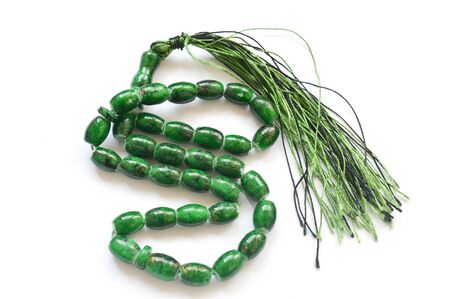green rosary beads on white background