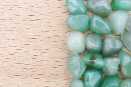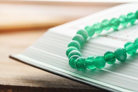 green beads on a wooden background