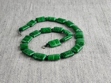 Handmade beads made of green malachite on burlap background.