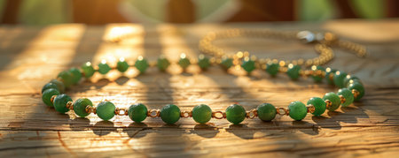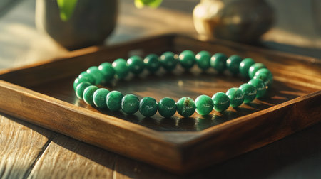 An exquisite green bead bracelet rests elegantly on a wooden tray, bathed in soft natural light, showcasing its fine craftsmanship and stylish design.