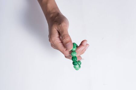 Green beads on a woman's hand on a white background close up
