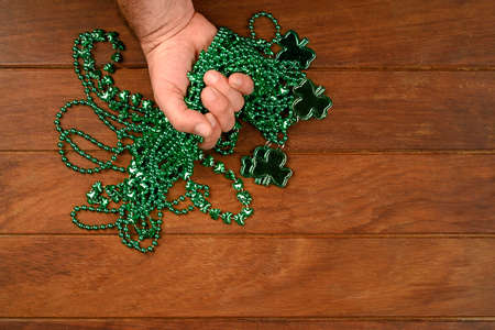 Concept of St. Patrick. A man's hand grabs green clover necklaces on wooden background, top view