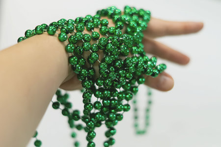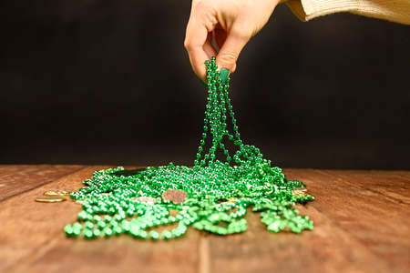St. Patrick's concept. A woman's hand picks up green clover necklaces.