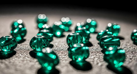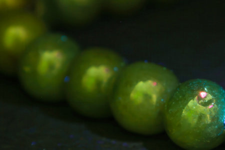Green glass beads on a black background. Shallow depth of field.