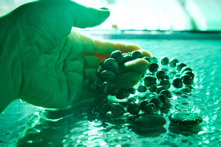 Jewelry from green malachite. Malachite beads in the studio on glass surface with water
