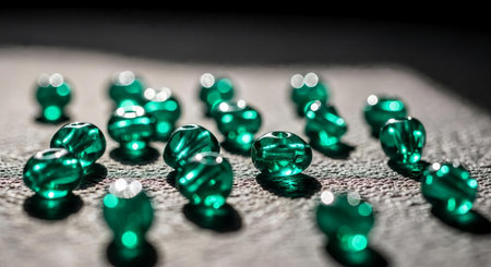 This stunning image features a close-up view of glimmering green gems. The intricate texture combined with a beautiful bokeh effect creates a striking visual experience.