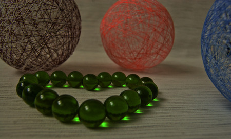 balls of yarn of different colors on a light background, heart of green glass beads