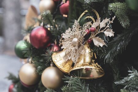 Gold Christmas bell is hanging among many red and white tree toys with blured background creating holiday mood