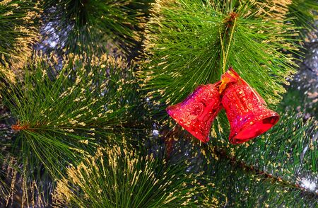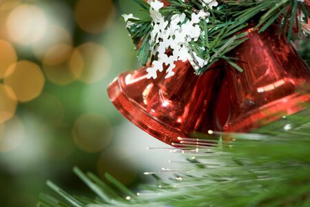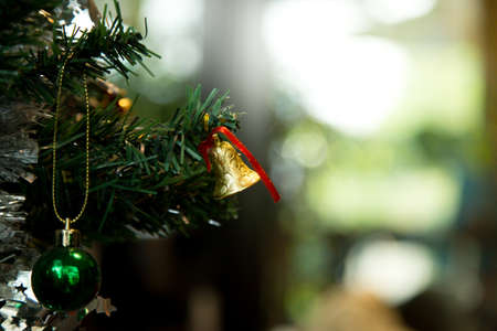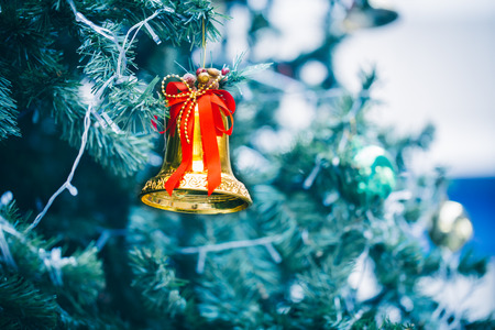 Christmas bell hanging on pine tree branch with bokeh background.