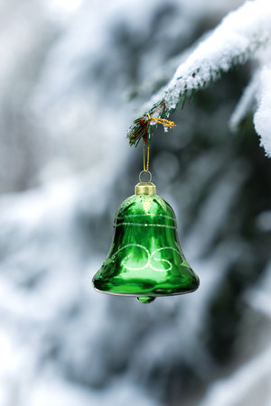 A shiny green Christmas bell ornament hanging from a snow-covered pine branch. Dreamy winter background. Selective focus.