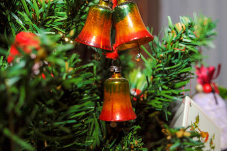 Bells decoration hanging on the Christmas tree with lights