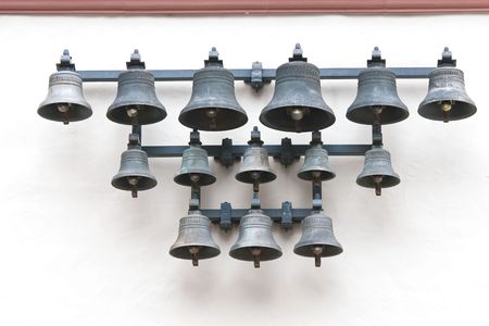 Modern bronze bells on background of white wall