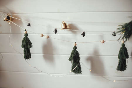 Stylish christmas garland with handmade trees and bells on white wooden wall with christmas lights. Festive decorated atmospheric scandinavian room. Boho simple handmade decorations