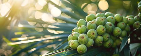 Saw Palmetto Leaves and Fruits: A Detailed Closeup. Concept Botanical Photography, Close-Up Shots, Nature Study, Plant Parts, Macro Photography