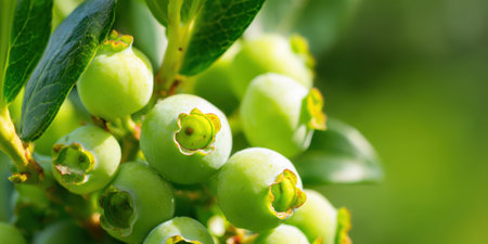 Unripe Green Blueberries Clustered on the Bush, a Promise of Sweetness in Summer Days