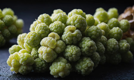 A close-up of a cluster of green mulberries, freshly picked from a tree in the garden