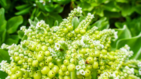 Tiny white flowers and berries of Heliotropium foertherianum growing along the coast in Maldives