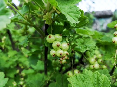 Green redcurrant berries on the bush. Red currants in the process of ripening. Ripening of red currants. Useful berries - red currant.