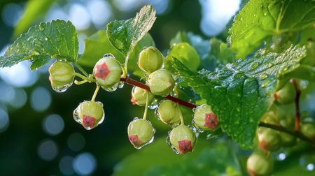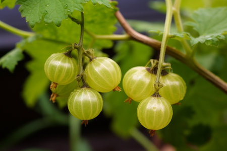 Fresh green gooseberries adorn a branch after a refreshing rain shower