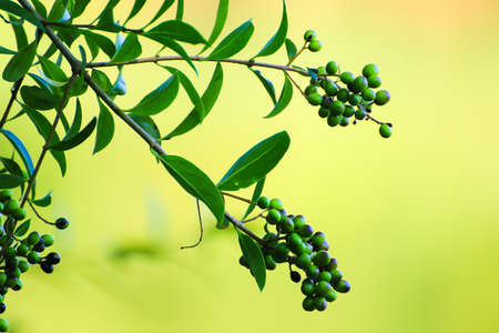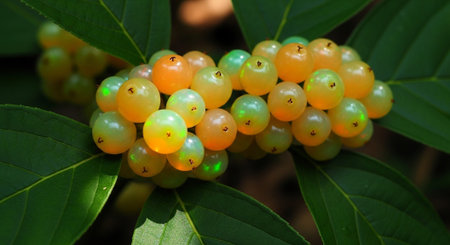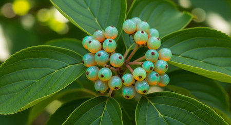 Lush green foliage of Ligustrum vulgare surrounds clusters of green berries showing the natural beauty of this decorative shrub in a vibrant garden.