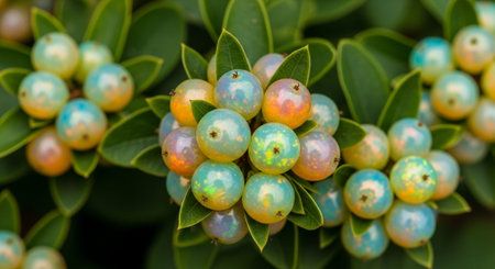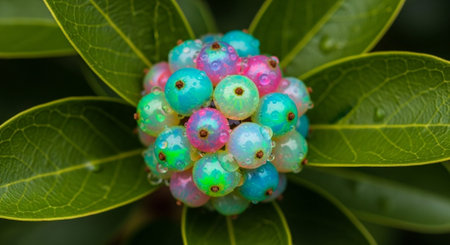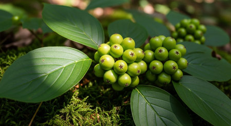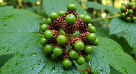 Close-up view of dewy green berries on a branch, surrounded by rich foliage. The water droplets enhance the fresh and vibrant nature of this serene scene.