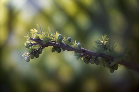 Fresh green gooseberries ripening on a branch in a natural setting
