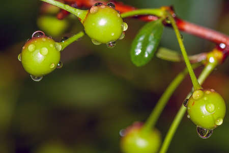Water drops on green cherry berries. Rainy weather concept.