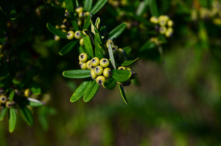 Pyracantha angustifolia (Orange firethorn) fruits. Rosaceae evergreen shrub. White flowers bloom in early summer and the fruits (drupes) ripen to orange in late autumn.