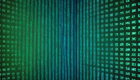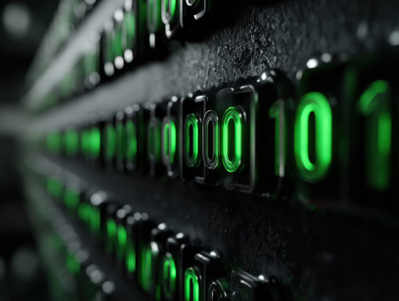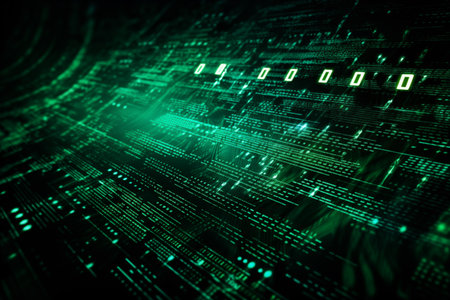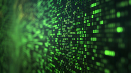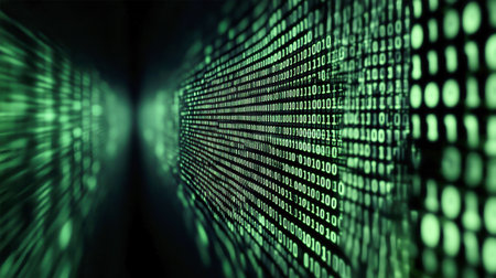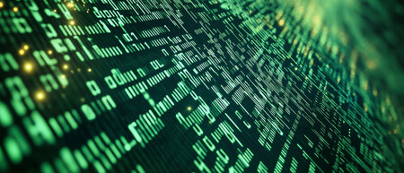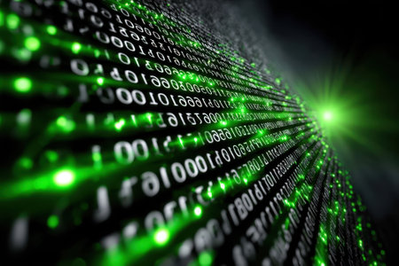 A vibrant display of green binary code illuminates a dark background, creating a high-tech atmosphere.