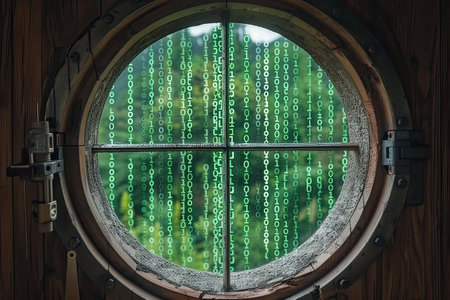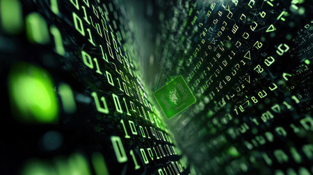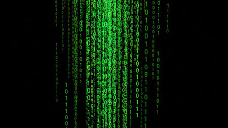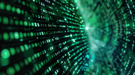 A visual display of cascading binary numbers creates a digital rain effect. The vibrant green tones contrast with the dark background, evoking a sense of deep technology.