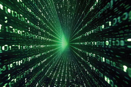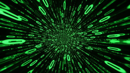 A dark tunnel is filled with a continuous stream of glowing green binary code, numbers 0 and 1, flowing inwards towards a black void. This abstract representation symbolizes data flow and digital...