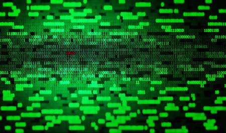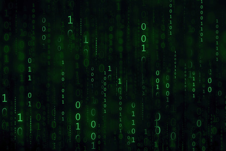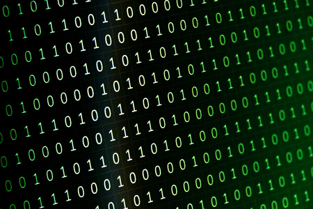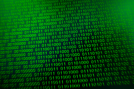 A set of random binaries captured with a camera from a laptop computer screen with inverted color and green tinting filter applied for digital or business concept background