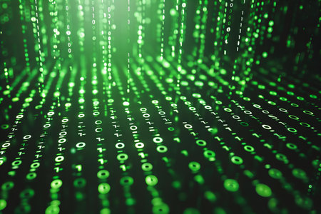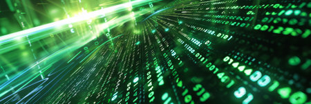 Abstract digital background with glowing green binary code streams, inspired by Matrix-style data flow.