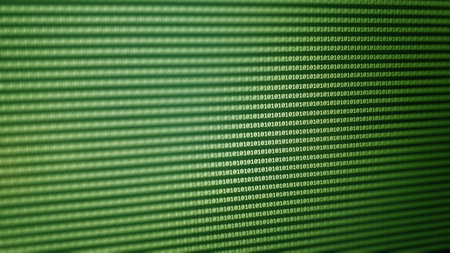 Green binary code on a computer monitor. Abstract technology background. Close up.