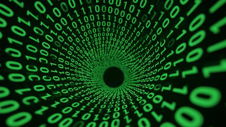 An abstract digital tunnel formed by green binary code numbers, appearing to zoom into a central vortex against a dark background.