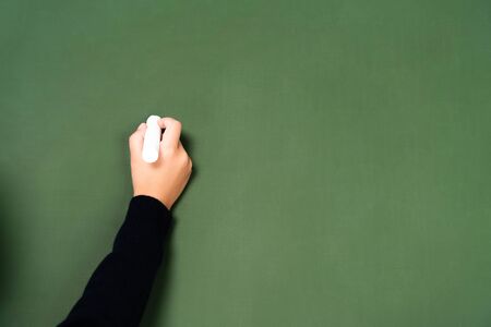 hand holding chalk writing on green chalk board good texture idea for text or background for copy space.