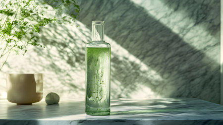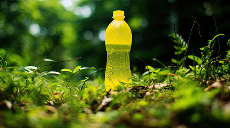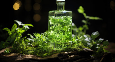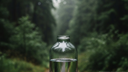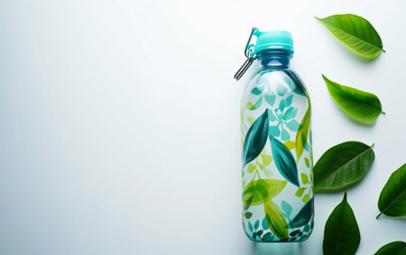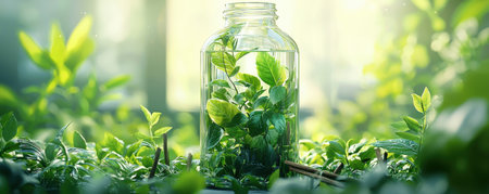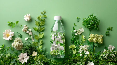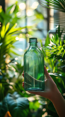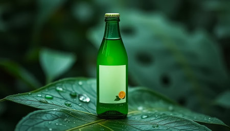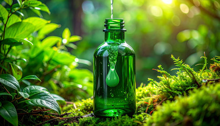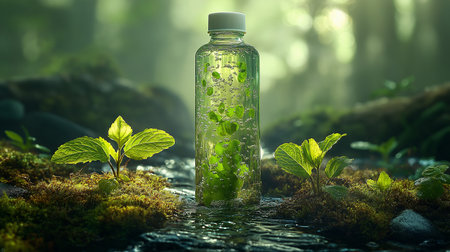 A vibrant green leaf emerges from a transparent bottle, symbolizing freshness and sustainability in an eco-friendly world. The lush background enhances the connection to nature.
