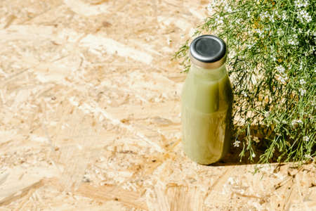 Glass bottle with green detox juice on wooden background. Minimal healthy lifestyle concept.