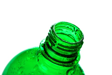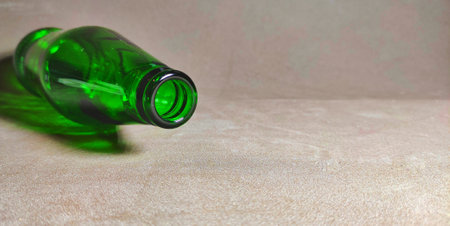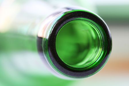 A close-up of a green glass bottles neck and cap, set against a blurred dark background. The focus highlights the bottles texture and color, creating a minimalist and artistic composition.
