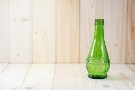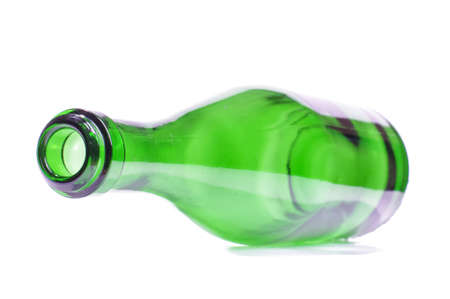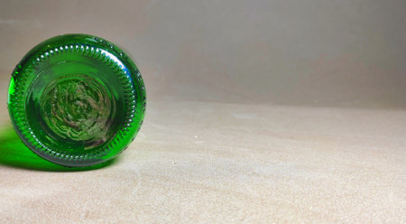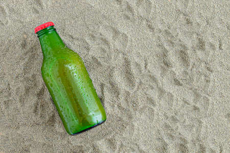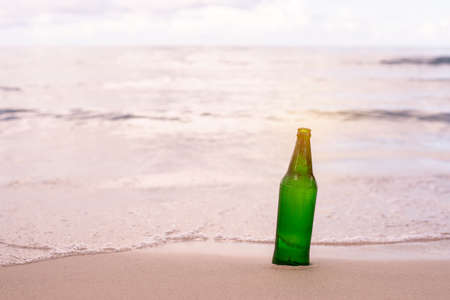 Green bottle glass on the beach,Ecology and environment concept,Trash pollution of sea